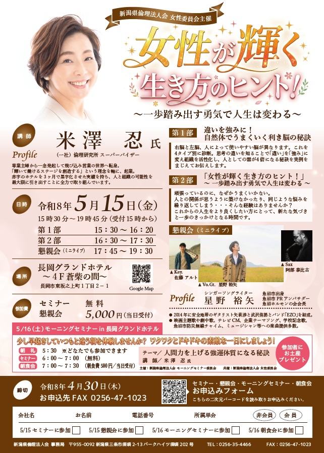 【新潟県倫理法人会 女性委員会】5月15日(金)アフタヌーン・ナイトセミナー